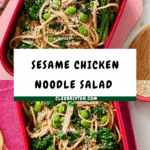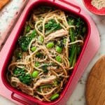 A vibrant and nutritious sesame, edamame, and chicken noodle salad featuring wholewheat noodles, tender shredded chicken, crunchy broccoli, and toasted sesame seeds, all tossed in a flavorful tahini and soy-based dressing. Perfect for a light lunch or a make-ahead meal.