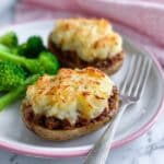 A comforting and hearty Shepherd’s Pie made with tender minced beef, rich gravy, and creamy mashed potatoes baked inside jacket potato skins, topped with melted cheddar cheese for a delicious twist on a classic dish.