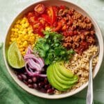 Keywords: spicy beef taco bowl, healthy taco bowl, chipotle beef recipe, wholemeal rice taco bowl, quick Mexican dinner, low fat beef recipe