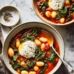 A flavorful and hearty Spicy Harissa Bean Stew featuring tender butter beans simmered with harissa, baharat spices, fresh vegetables, and spinach, topped with creamy ricotta and fresh basil. This comforting stew is perfect for a warming meal that’s both nutritious and packed with bold, spicy flavors.