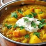 A hearty and flavorful Spicy Root & Lentil Casserole featuring tender potatoes, carrots, and parsnips simmered with red lentils in a rich curry-spiced vegetable broth. This comforting vegetarian main dish is perfect served with a dollop of low-fat yogurt and warm naan bread.