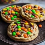 Three round cookies rest on a dark textured plate placed on a white marbled surface. Each cookie has one main layer of soft, golden-brown dough with a slightly cracked surface. The top layer is fully covered with small, colorful candy pieces in bright orange, yellow, green, and brown. There are smooth, round candy-coated chocolates and small rectangular chocolate pieces evenly spread out, giving a textured and vibrant look to the cookies. In the background, part of an orange item is visible, adding warmth to the scene. photo taken with an iphone --ar 4:5 --v 7