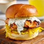 Keywords: Sriracha chicken burger, grilled chicken burger, pickled cabbage, spicy chicken sandwich, cucumber relish, barbecue chicken burger
