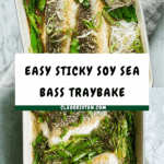 Keywords: sea bass traybake, soy sauce fish recipe, healthy fish dinner, Asian inspired fish, one tray dinner, sticky soy fish, roasted greens, rice noodles