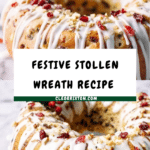This Stollen Wreath recipe combines traditional German holiday flavors with a festive twist, featuring a soft, yeasted dough enriched with soaked dried fruits, chopped pistachios, and a marzipan center. Baked to a golden perfection and adorned with a sweet fondant glaze and decorative cranberries and pistachios, it makes a stunning centerpiece for your holiday table.