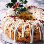 This Stollen Wreath recipe combines traditional German holiday flavors with a festive twist, featuring a soft, yeasted dough enriched with soaked dried fruits, chopped pistachios, and a marzipan center. Baked to a golden perfection and adorned with a sweet fondant glaze and decorative cranberries and pistachios, it makes a stunning centerpiece for your holiday table.