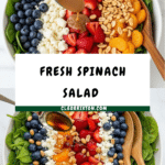 A vibrant and refreshing spinach salad featuring a sweet and tangy balsamic honey dressing, topped with fresh blueberries, strawberries, mandarin oranges, creamy feta cheese, and crunchy honey roasted peanuts. Perfect for a light lunch or a tasty side dish.