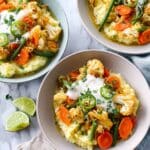 A hearty and flavorful Sweet Potato Dhal paired with vibrant curried vegetables, this recipe features tender lentils simmered with sweet potatoes and aromatic spices, complemented by a medley of curried green beans, cauliflower, and carrots. Served with cooling natural yoghurt, fresh coriander, and lime wedges, this comforting dish blends spice and freshness into a nutritious, satisfying meal perfect for any day of the week.