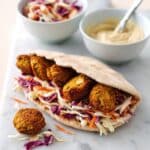 Store leftover falafels and coleslaw separately in airtight containers in the refrigerator for up to 3 days. Reheat falafels in the oven at 180°C until warmed through to maintain their texture. Keep pitta breads in a sealed bag at room temperature and toast fresh before serving.
