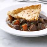 - Assemble the pie: Roll out the pastry on a floured surface so it is slightly larger than the pie dish’s top. Lay the pastry over the meat filling, trimming the edges with scissors so it slightly overhangs. Make two small slits in the center of the pastry lid to allow steam to escape.