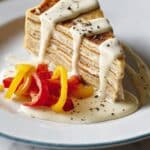 A white plate holds a slice of light yellow crepe roll filled with dark brown chocolate layers, topped with a white creamy sauce that drips down the sides. Around the crepe slice are small pieces of red and yellow bell peppers, also covered lightly in the white sauce. Some black pepper flakes are sprinkled on top of the sauce. The plate rests on a white marbled surface. Photo taken with an iphone --ar 4:5 --v 7