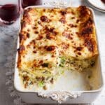 A comforting Winter Greens, Walnut & Sage Lasagne featuring layers of tender Savoy cabbage, kale, and leeks cooked with aromatic sage, enveloped in a creamy, subtly spiced white sauce with mozzarella and nutty walnuts, then baked to golden perfection. This vegetarian lasagne blends rich flavors and textures for a hearty and warming meal.